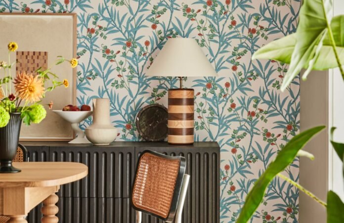 Parce qu’il est encore plus impactant visuellement de dépareiller couleurs et motifs, on ne se refuse pas un papier peint végétalisé semblant tout droit sorti d’une maison de campagne anglaise. Effet cottagecore garanti !