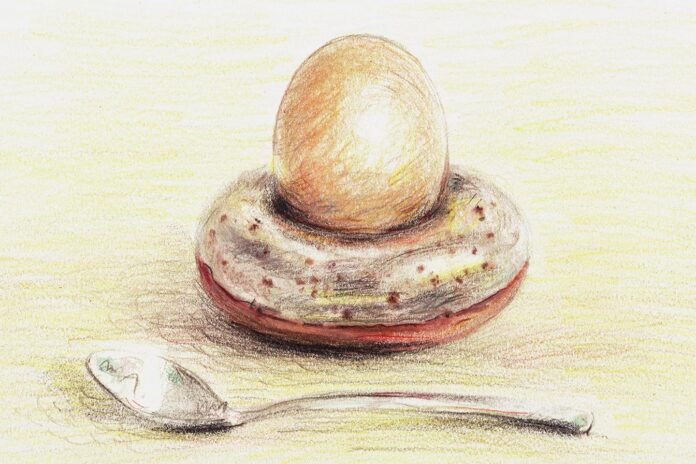 En absence de l’objet, elle explique que l’anneau d’une alliance peut faire office de coquetier de substitution, et que les collectionneurs préfèrent en général ceux en porcelaine fine plutôt qu’en argent et sans soucoupe pour les coquilles – même si les premiers prennent trop de place dans une vitrine et que les seconds s’oxydent et demandent de l’entretien. Ceux de Céline Fischer, céramiste et fondatrice de Coedo Ceramics, spécialisée dans « les objets du garde-manger qu’on ne laisse pas dans les placards », ressemblent à des donuts en céramique, avec inclusion de sable « glané en Italie ».